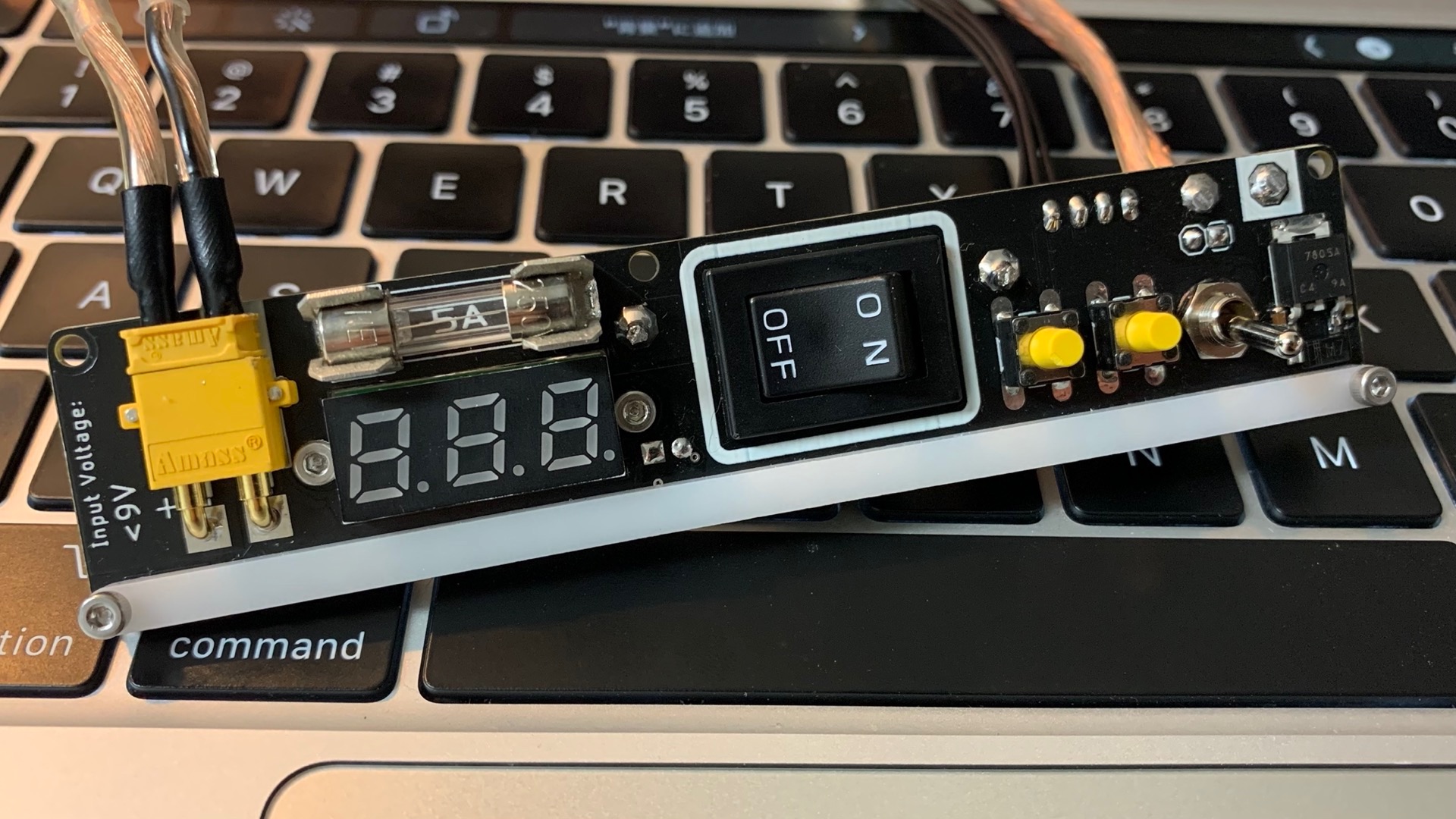 黒の艶消し基板に黄色いコネクタとスイッチが映える電源・UI基板です。電源スイッチは安全管理の一環として押しやすいものにし、かつ周りに白いシルクを入れることで目立つようにしています。