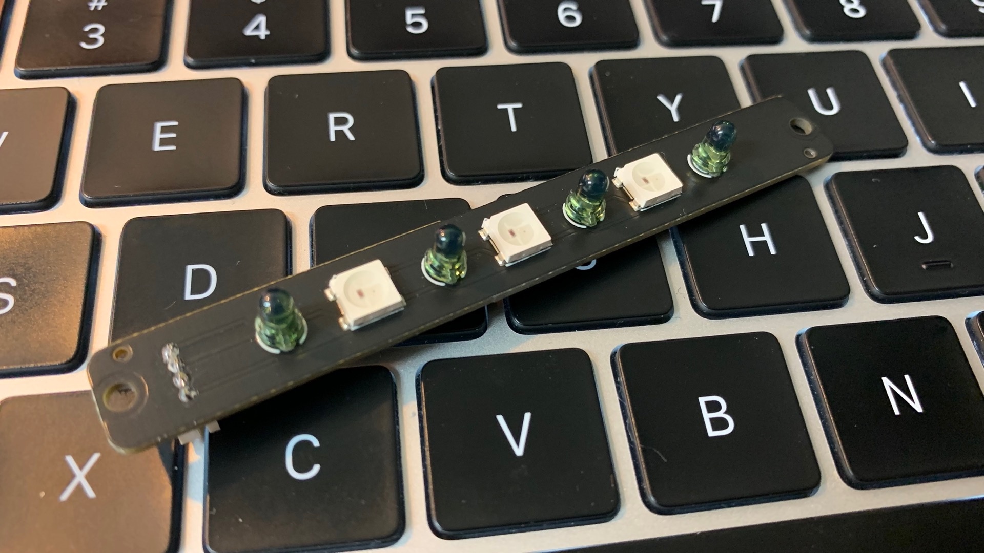 この白いバーの裏には24個のLEDが載っています。こんなんなんぼあってもいいですからね〜。この密度でLEDを24個手半田するとなると本当に地獄なので部品実装サービスがあったからこそできた設計です。ぜひ全国大会では多くの人に光る姿を生で見てもらいたいなと思います。